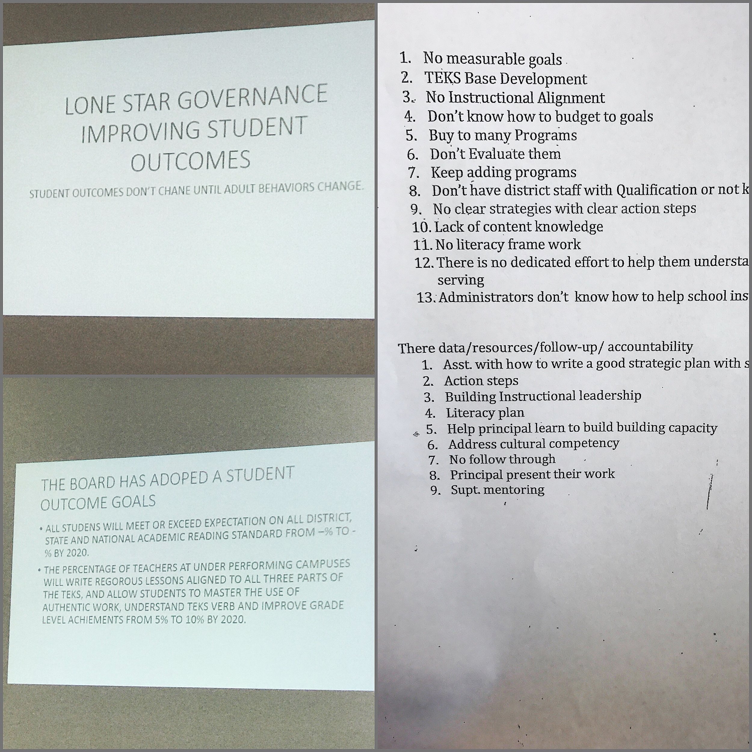 From Saturday’s meeting, it also appears the Board has been ordered to take other actions, such as writing goals for the district and developing the superintendent’s evaluation metrics. Setting goals aren't unusual for school boards, but the specificity by which the TEA is telling the board how to define those goals is shocking.